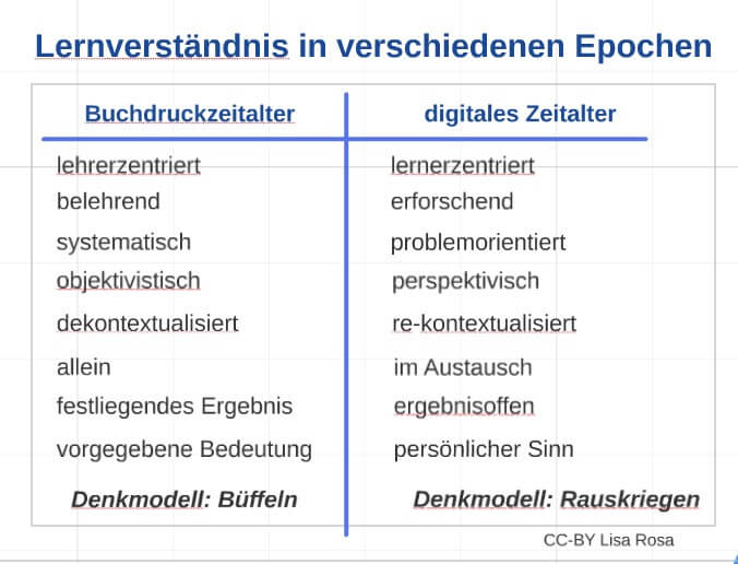 gegenüberstellt (vgl. Rosa (2017)). Entscheiden hierbei ist, dass sich zwei unterschiedliche Denkmodelle bezüglich des Lernverständnisses ergeben. Im Buchdruckzeitalter wird Lernen aufgrund der gegebenen Medien als Form des „Büffelns“ aufgefasst, während heute es eher ein „Rauskriegen“ ist (ebd.).